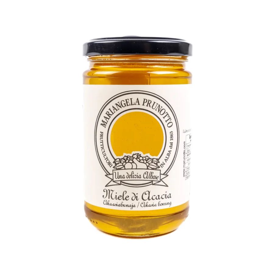 Akaasiahunaja on Italian arvostetuin ja tunnetuin hunajalaji. Mariangela Prunotton ensiluokkainen ja hienovaraisen aromikas akaasiahunaja kerätään pesistä, joita liikutellaan Langhen kukkuloilla, Alban ympärillä akaasiapuiden katveessa.