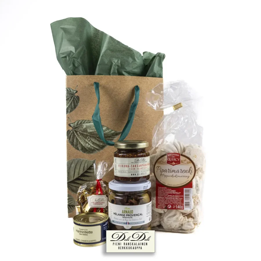 1594 – KORI lahjaikassi ruskea-lehtikuvio pieni 19x9x27cm