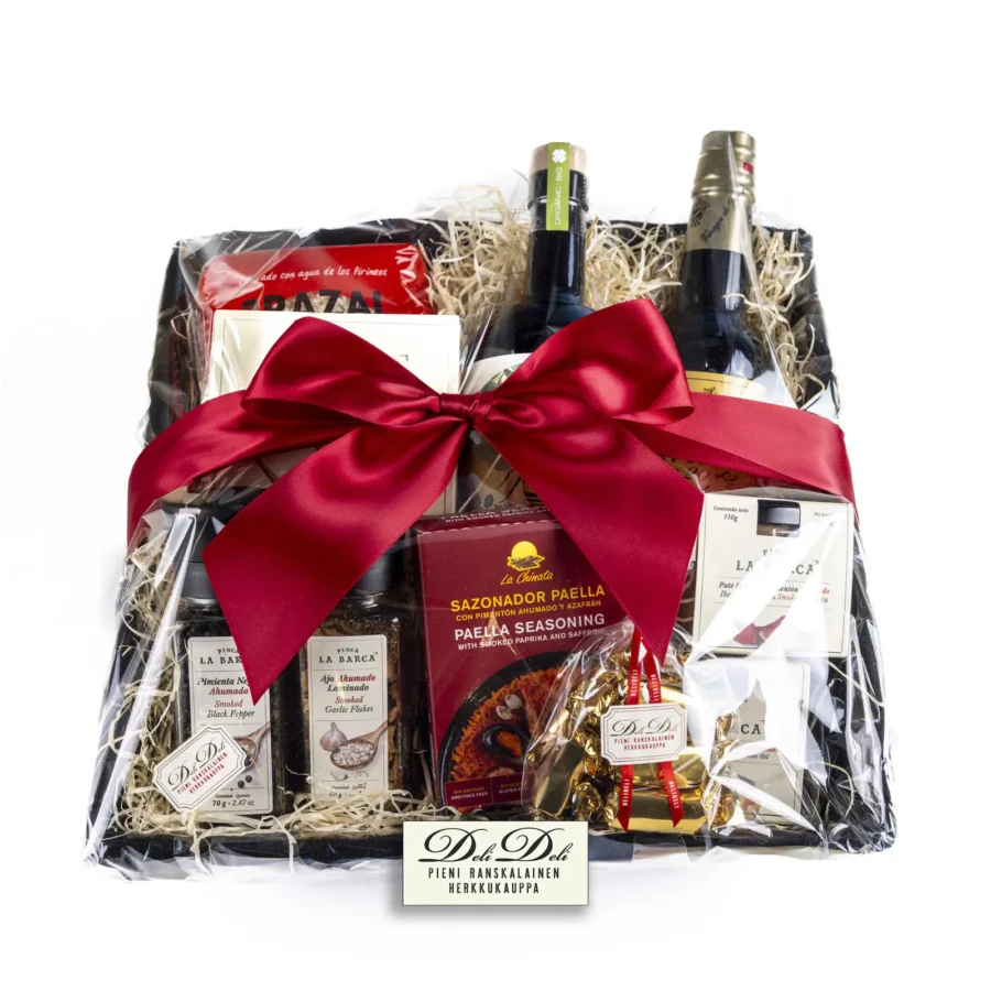 Korkea polyfenolinen luomu extra oliiviöljy on pakattu niin kauniisti, että sen voi pitää pöydällä aina koristeena. Alkupalaksi voi laittaa esille Iberian possusta tehtyä pateeta ja savustetulla paprikalla maustettua vuohenjuustolevitettä. Paellaa varten on riisi ja mauste, lisää vain omavalintainen liha, kala tai merenelävät, koristeeksi paahdetut Piquillo paprikat. Mausteena valkosipulin ystävän ehdoton mauste, savustettu valkosipuli. Tyylikäs lämminhenkinen kori sopii monelle.