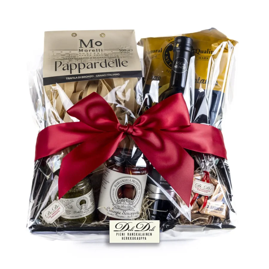 Tämän korin sisältö on todella laadukas ja helppo antaa. Korin tuotteista voit valmistaa helposti korkealuokkaisen italialaisen aterian.