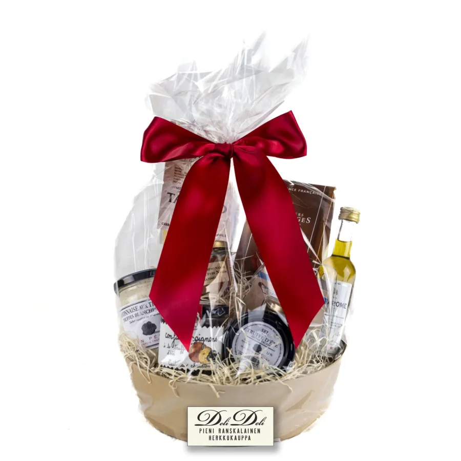 Tryffeli Delux korin saaja pääsee todella sisään tryffelin maailmaan. Tällä yhdellä maailman kalleimmasta mausteesta saa loihdittua uskomattomia aterioita lisäämällä jotain korin tuotteista esim. pastaan, lihalle, risottoihin, keittoihin tai vaikka perunalle. Vitsinä mukana myös suklaatryffeli, jossa ei tätä maustetta ole, mutta nimi on varmasti alkujaan peräisin tästä sienikasvista.