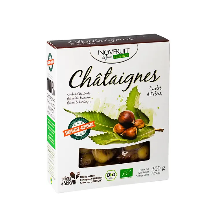 Inovfruitin luomukastanjat ovat ranskalaisia, huolellisesti valikoituja laatukastanjoita, jotka on kuorittu, kypsennetty ja pakattu tyhjiöön säilyvyyden varmistamiseksi. Vakuumipakkaus takaa, että kastanjat säilyttävät mehevyytensä, täyteläisen makunsa ja ravintosisältönsä aina avaushetkeen asti.
