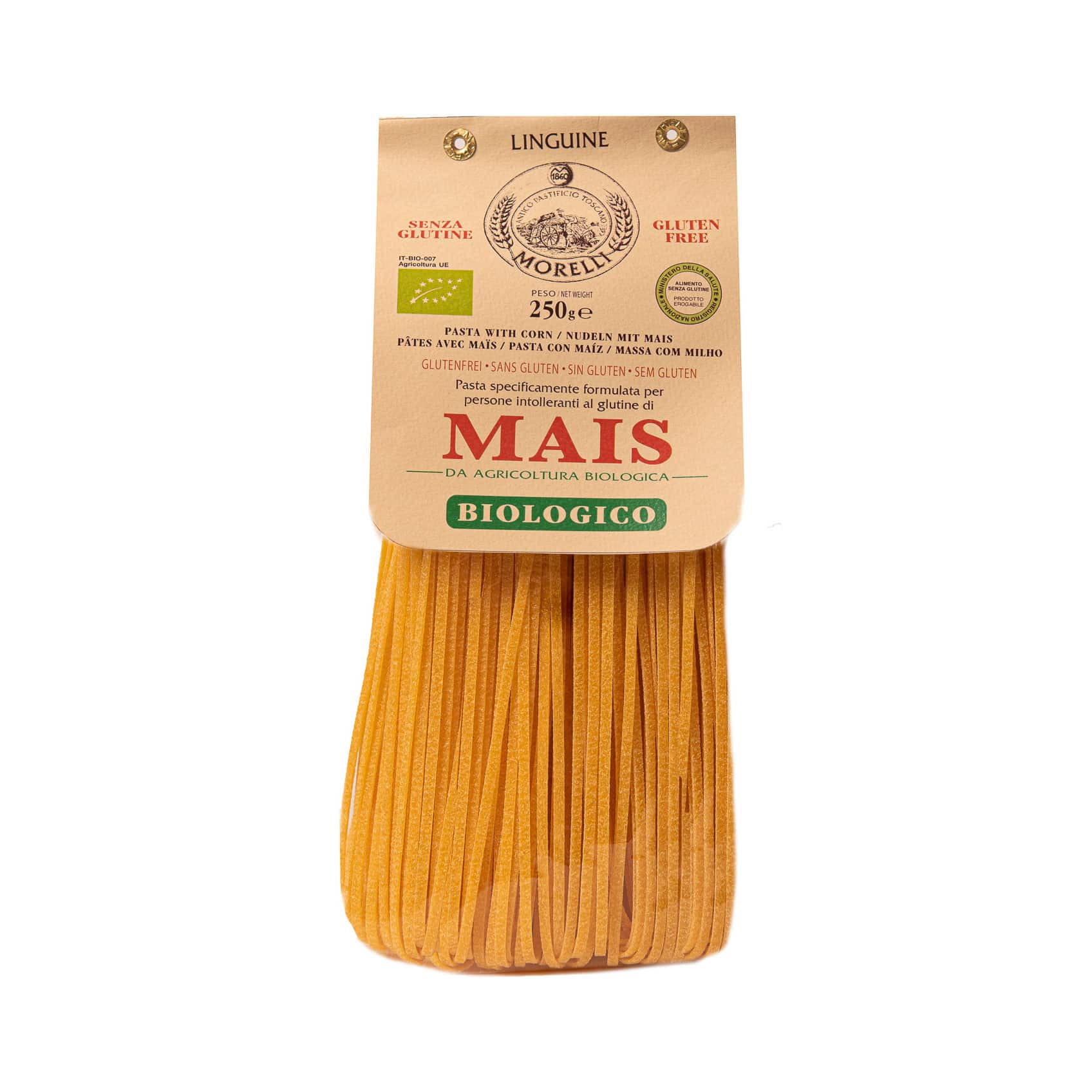 Toscanalaisen Morellin pastatehtaan maissipasta on luonnostaan gluteenitonta linguine-pastaa. Pastassa käytetty maissi on lisäksi puhdasta luomutuotantoa. Keittoaika 7–9 minuuttia.