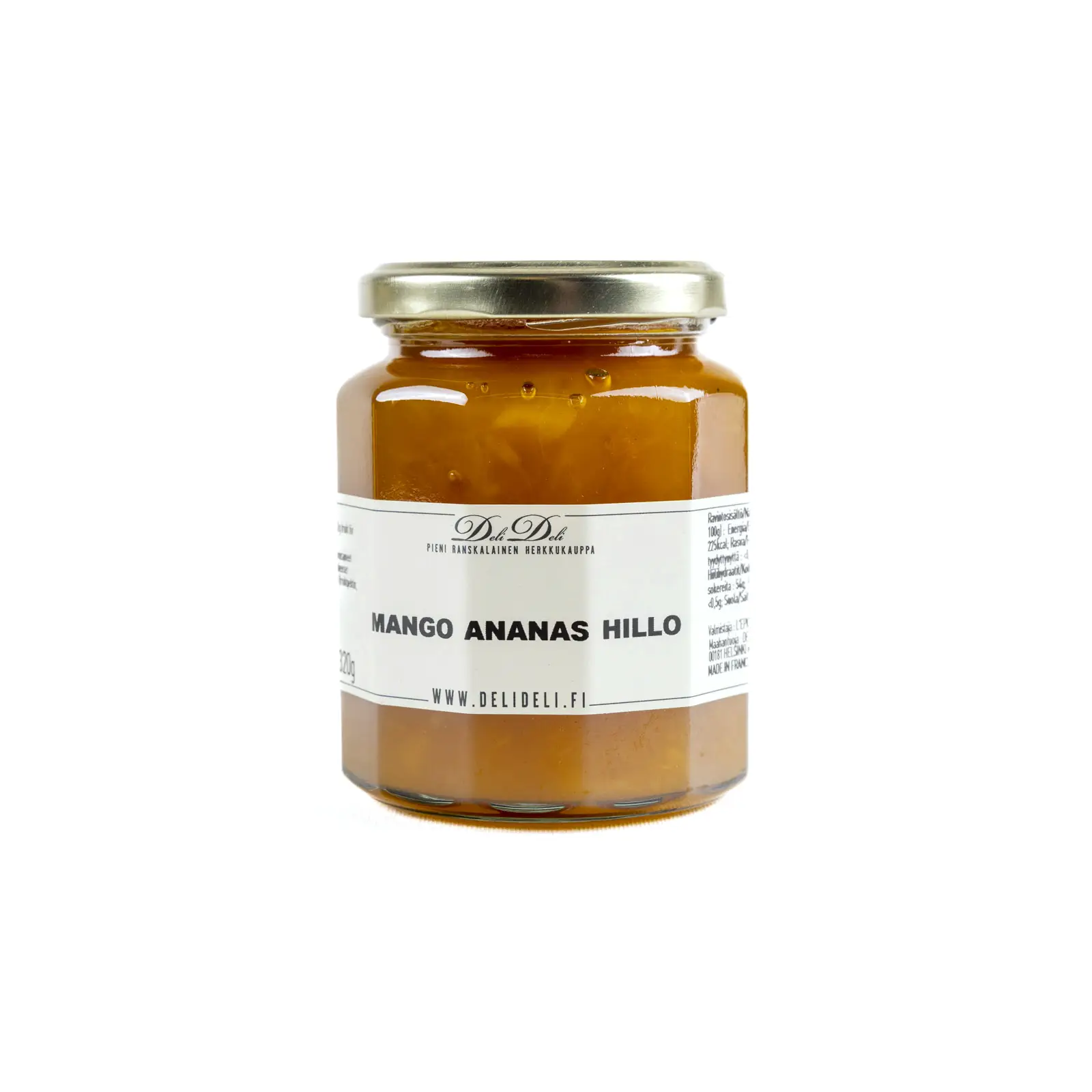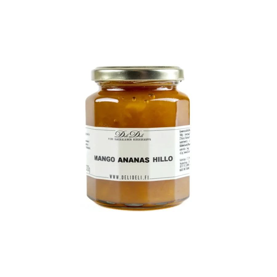 DeliDelin oma mango-ananashillo on trooppisen makea ja maukas hedelmähillo. Ananas tuo siihen kuitenkin hieman sopivaa hapokkuutta. Hillo sopii täydellisesti esimerkiksi panna cottan päälle, erilaisiin kookosjälkiruokiin ja hedelmämousseen.