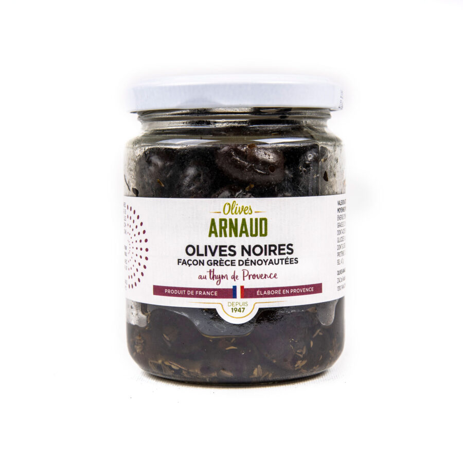 Provencelaisen Olives Arnaud’n timjamilla maustetut kivettömät tummat oliivit on valmistettu kreikkalaiseen tapaan. Auringonkukkaöljyyn säilötyt ja timjamilla maustetut tummat oliivit on valmistettu vain parhaimmista oliiveista ja luonnollisista raaka-aineista, minkä kyllä huomaa maussa!