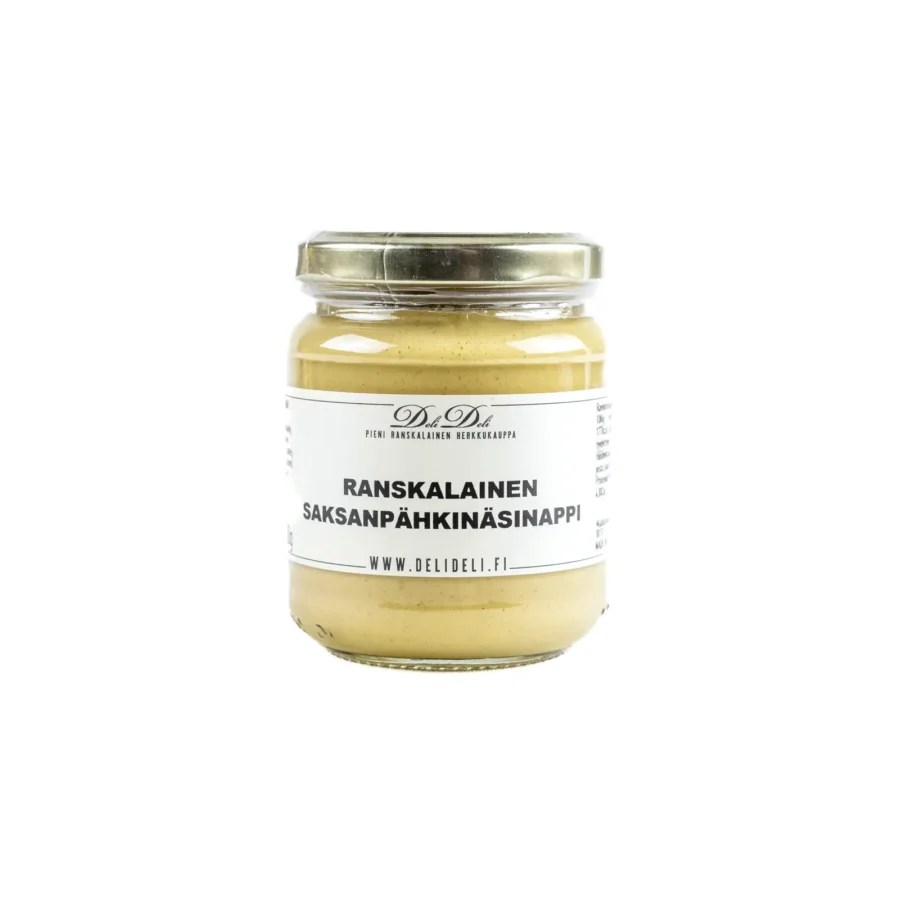 DeliDelin ranskalainen saksanpähkinäsinappi on lempeän herkullinen sinappi. Saksanpähkinä pyöristää sinapin kirpeyttä täydellisesti. Kokeile saksanpähkinäsinappia salaatinkastikkeissa, suolaisen piiraan pohjalla, siipikarjan kanssa tai vaaleilla lihoilla.