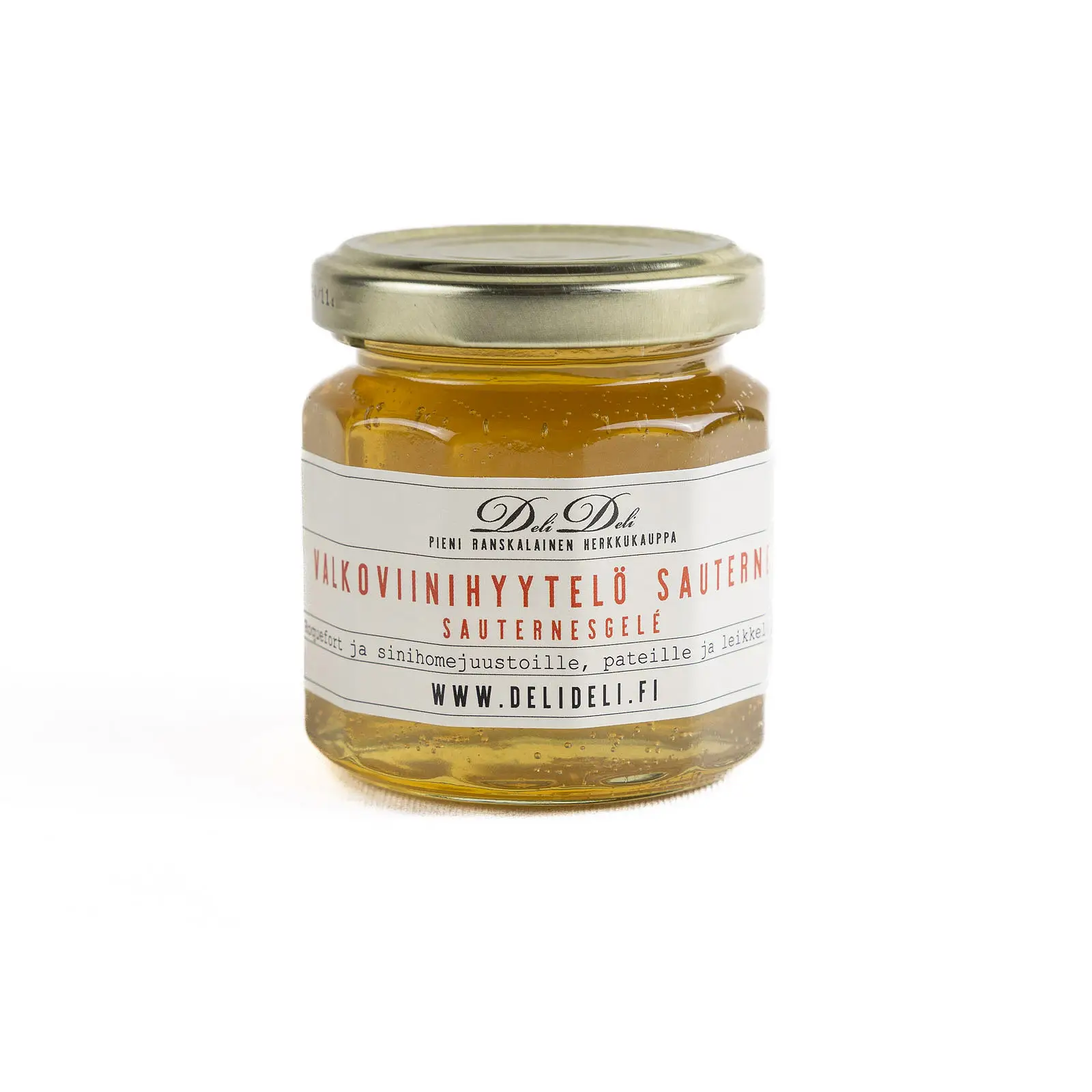 Sauternes on kuuluisa ranskalainen makea valkoviini Bordeaux’n alueelta. Sen kultainen väri ja rikkaat aromit tekevät siitä täydellisen valinnan juustohyytelöksi. Hyytelössä on 50% Sauternes-viiniä, ja sen maku on täyteläinen ja harmoninen.