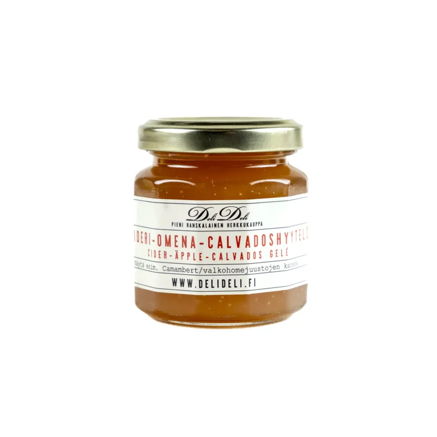 DeliDelin siideri-, omena- & calvadoshyytelö tuo juustolautasellesi aromikkaan tuulahduksen Normandian omenatarhoilta. Hyytelö valmistetaan puhtaista raaka-aineista ilman turhia lisä- ja säilöntäaineita. Se on erityisen täydellinen kumppani camembert-, pont l’Evêque- ja livarot-juustoille. Kokeile ja ihastu!
